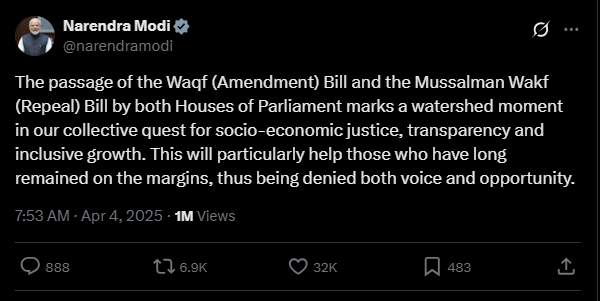 On Friday, April 4, 2025, Prime Minister Narendra Modi cheered the approval of the Waqf (Amendment) Bill 2025 and the Mussalman Wakf (Repeal) Bill by India’s Parliament for Watershed Moment. He called it a “turning point” that will help India move toward fairness, openness, and growth for everyone.